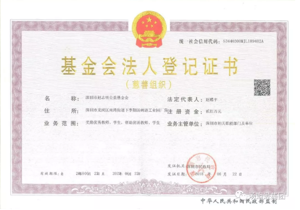 2018年6月22日由深圳市民政局批准《深圳市赵志明公益基金会》正式成立。公益基金会重点扶持奖励优秀教师、学生,帮助贫困教师、学生。基金会本着“践行社会责任,回馈社会大众,构建和谐社会”的精神,通过各种慈善方式开展社会救助活动。这不仅圆了汤姆逊集团董事长赵志明的心愿,也进一步彰显了企业家的强烈社会责任感和回报社会的感恩之心,诠释了汤姆逊集团的大爱,而基金会的专业化运作标志着汤姆逊集团探索的公益长效机制正在建立。